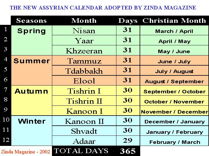 ZINDA MAGAZINE ADOPTS A NEW ASSYRIAN CALENDARIn the years before the advent of Christianity the Assyrians in Bet-Nahrian used a calendar based on the new moons nearest to the vernal (spring) and autumn equinoxes. Each year the vernal equinox occurs around March 20-21. The 12 months in the Assyrian calendar were (modern names in parenthesis)